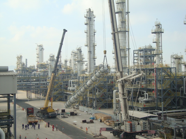 国庆期间,烟台万华工程项目部PO技改项目2204单元迎来了第一次大干高潮。10月4日上午,2204单元废PO精制塔顺利吊装完成,比业主原定节点提前一天完成,给后续工艺施工创造了条件。 2204技改单元是在原PO精制单元的基础上,增加了一个钢结构框架、1台塔、12台静设备和6台动设备,增加工艺管道6000余吋口,要求10月25日管道主体完成。废PO精制塔吊装是整个施工过程中关键的一个环节,也是非常重要的一个节点。塔高40.4米,净重29吨,9月25日到货后在地面安装劳动保护和附塔管线,10月3日完成所有动火项,包括设备保温及电仪部分,达到吊装条件。